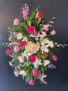 Nuestra Cabaña de Flores le ofrece una linda corona compuesta con hermosas rosas, hortensias, lirios, dendrobiums (flor de orquídea) y stock para dar el respeto a alguien especial. Obsequie el encanto de ésta hermosa composición floral.