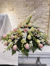 Lleve a su ser querido con estilo y honor con el arreglo Cala White & Pink Casket. Preparamos este arreglo único con una selección de rosas, lirios cala, dendrobiums blancas (flor de orquídea) y stock. Un recordatorio de amor y respeto para un día de descanso eterno.