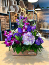 ¡Sumérgete en la magia de la Dulce Violeta! este arreglo floral incluye elegantes rosas, radiantes tulipanes, delicadas hortensias, maravillosas astromelias, exóticos dendrobiums (flor de orquídea), seductores lirios y un toque de curly willow y wax flower para darle el toque final al maravilloso viaje de esta composición en una base en madera. ¡Explora la delicia que ofrece el poder de la naturaleza!