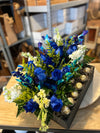 ¡Un regalo único para alguien especial! Dulces Pétalos ofrece un arreglo floral impresionante en una base de madera negra completamente artesanal. Incluye siete (7) rosas, chocolates Ferrero Rocher, lirios tigre y salals. ¡Es el regalo perfecto para cualquier ocasión!