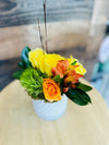 Presentamos a Frida: un hermoso arreglo floral que presenta una base de cerámica blanca y una encantadora combinación de rosas amarillas y naranjas, astromelias (lirios peruanos), green balls y stock.