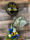 ¡Celebre el cumpleaños de alguien especial con el Happy Birthday para Hombres! Este arreglo floral de lujo incluye rosas azules, blancas y amarillas, girasol, dendrobiums y cymbidiums (flores de orquídeas), tulipanes y stock en una hermosa base dorada. ¡También dos globos, uno redondo y uno en forma de estrella, preparados con cariño para hacer este regalo único!