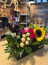 Aprecia la celebración con el regalo perfecto: Pama Surprise. Un arreglo floral que no dejará indiferente a nadie, con botella de PAMA, seis (6) chocolates Ferrero Rocher y una base en madera compuesta de rosas, girasoles, solidagos y stock. ¡Dale un toque único con Pama Surprise!