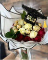 ¡Sorprende a tu graduando con este ramo único! Compuesto por veinticinco (25) rosas rojas y blancas envueltas en un papel traza elegante, un birrete decorativo para que llene el evento de felicidad, y dulces chocolates Ferrero Rocher para alegrar todavía más el día. ¡El ramo perfecto para celebrar la graduación!